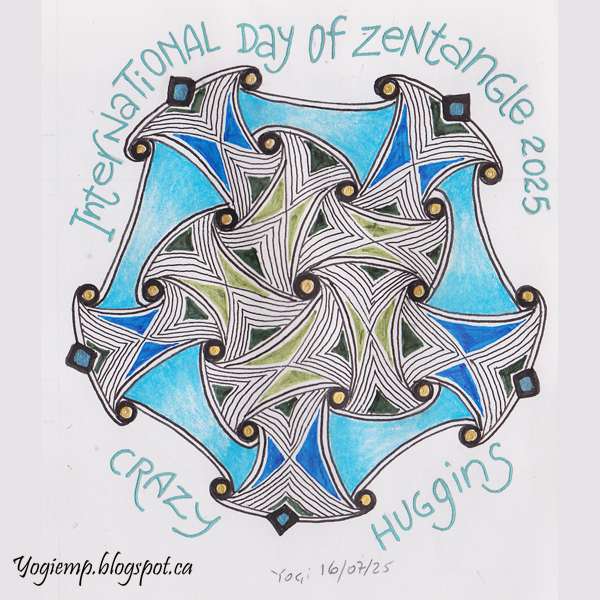 size: 5"h x 4.5"w I saw the replay of International Day Of Zentangle and decided I'd play with the tangle. On Canson XL Pen &Ink Paper using a ZIG Writer for the outlines and a Juice U pen for the details. Colored with Prisma colored pencils and various metallic and gel pens. words: International Day Of Zentangle 2025 Crazy Huggins |