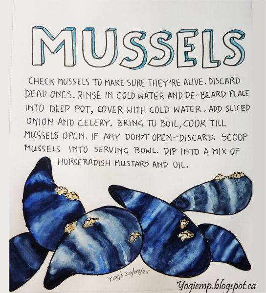w/c Mussels - Mussel Recipe Created: March 31, 2025 size: 4.5" w x 6" h I had mussels on my mind. Been a while since I made a batch... I used to eat them a lot when I lived on PEI. When I finished painting them couldn't figure out what to write about them and then decided on the recipe I use. The ones I used to eat didn't have these pronounced stripes and shading nor did mine have barnacles - artistic license... Done on Canson Pen & Ink paper, Zig Writer, w/c, Juice Up pen. words: