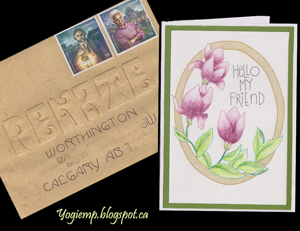 Envie made with Elephant Hide paper embossed your name using a double layer of Staples 110# cardstock to create the Wes Wilson style letter template and then using 4 sizes of embossing tools. Shadowed the letters with a Posca brownish pencil crayon. The address done in an Art Nouveau style with a ZIG Writer. |