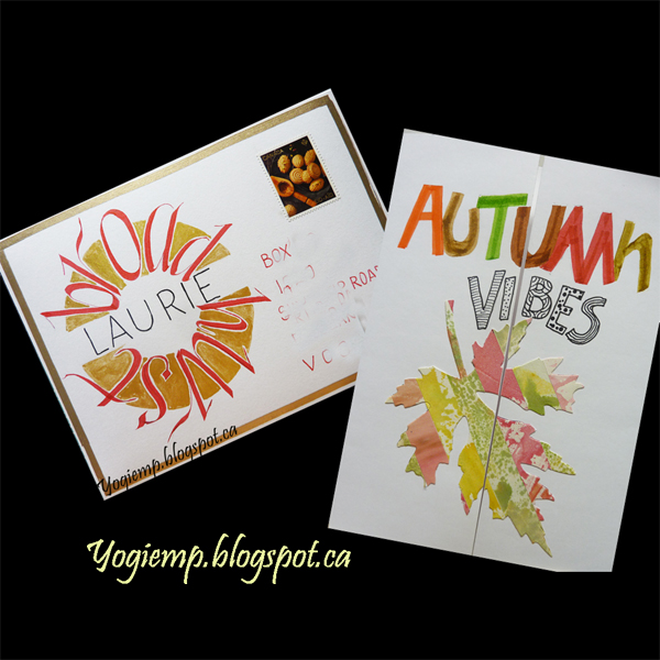 ID: Laurie Bradhurst (Nov 2025) Env created on Canson Mixed Media paper. Drew out some circles and with a broad edge red ZIG Calligraphy pen wrote out Laurie's name. Painted with Kuretake Yellow Gold paint between the letters. Added "Laurie with a black ZIG Writer. Edged a border on the envie with the same gold The card is a funky center fold. Wrote out the AUTUMN word with various colors of the Calligraphy markers. The "vibes" word doodled with a black ZIG Writer. The leaf created with various scraps of paper glued to another sheet and die cut with Tim's "Layered Leaf" Sizzix Bigs die. |
