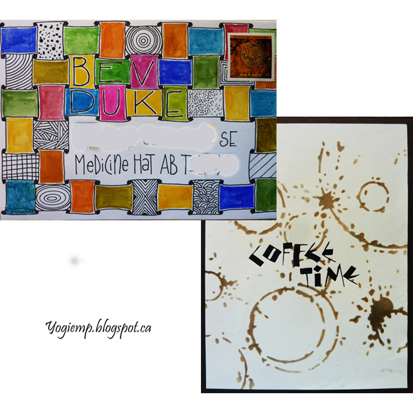 ID: Bev Duke (Oct 2025) Env created on Genoa Bond paper. I decided to go with bit of Celtic... Created the grid layout and colored and doodled with various tools. Bummer you can't see the lion stamp more clearly... The insert (not a card) was something I created a long time ago creating faux coffee rings and my funky lettering. |