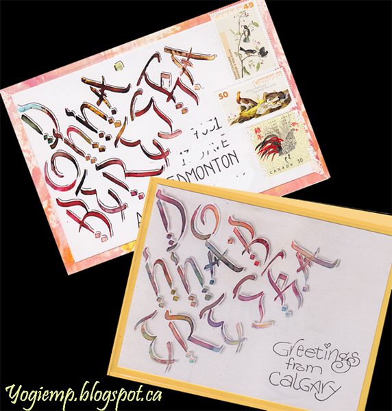 I used a piece of Edge Mixed Media heavy paper for both the env and card trying out different powders to create her name done in Lisa Engelbrechts funky lettering style. For the envelope I used Bister powders (Yellow, Red and Blue), a 3.0 Parallel pen dipped in water and when dry, shadowed with a Juice Up pen. Adhered the artwork to a plain envelope and added a geli print border. For the card (7"w x 5"h) I used Brusho Powders (yellow , red & ost Blue) and shadowed with a Caran d'Ache B pencil and paper stump. Mounted on a yellow cardstock card base.