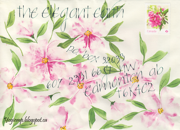 The Edmonton Calligraphy Society extended the deadline for a postmarked envelope... so decided to make a couple more envies. BIG GRIN Since I just took a class with Mike Gold "Variations on "A"" I decided to use that techniques for one of my envies replacing the "A" with "E" Outlined the boxes with Derwent Inktense watercolor pencils and then blended with a wet brush. Wrote the various letters with Micron pens. Sponged the envelope edges with Distress pads. Since I wanted to kind of match the flowers with my stamp I used my triangle brushes and Winsor & Newton watercolors. Used a pointed pen and green gouache for the Weaver style lettering.