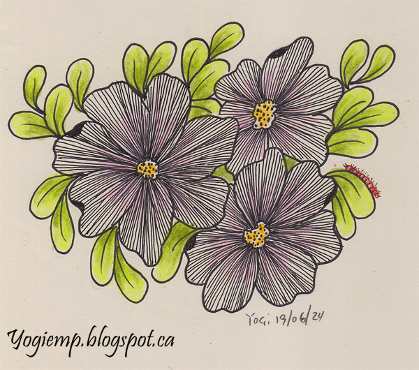 Created: June 16, 2024 This is another doodled flower while playing with the gals. On Genoa Bond paper created the flowers with a Juice Up Pen and Posca colored pencils. Added the caterpillar at the last moment. It just needed to be there...