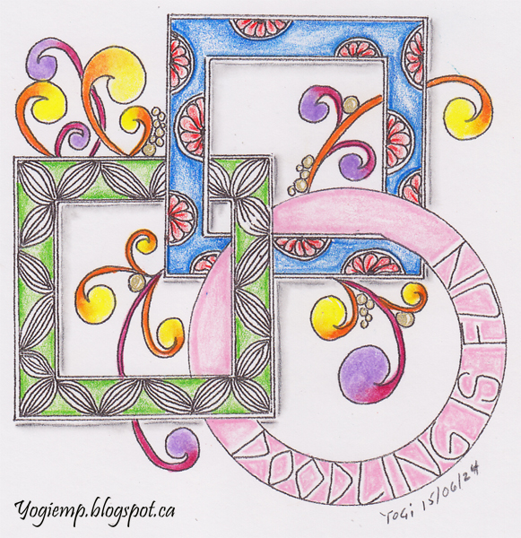 Created: June 16, 2024 Again something I saw in my Pinterest feed... the rectangles then added the circle and words. I created the design on regular paper, scanned it and printed it out on Staples 110# cardstock. Colored with Posca colored pencils and metallic gelly roll pens. Graphite shading. words: Doodling Is Fun