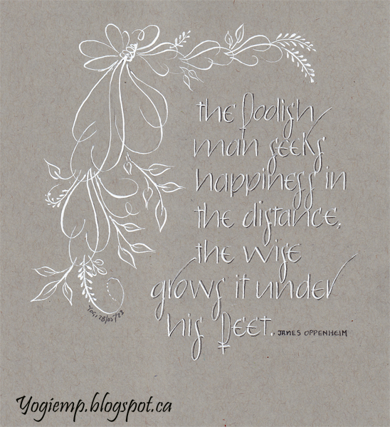 Created: May 28, 2023 I signed up for the Workshop Week 2023 hosted by The Happy Ever Crafter on an online platform Thought I'd do another piece while I was on a roll...This artwork was taught by Benjawan Klapstein "Pointed Pen Flourishing". On Strathmore Toned Gray paper a pointed pen with Bleed Proof white ink and Nikko G nib. Added a shadow on the letters with a black Juice Up pen. Words: The foolish man seeks happiness in the distance, the wise grows it under his feet. James Oppenheim |