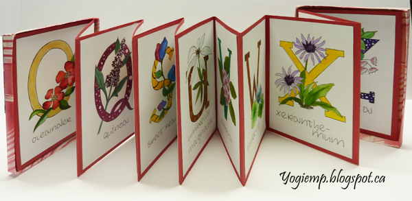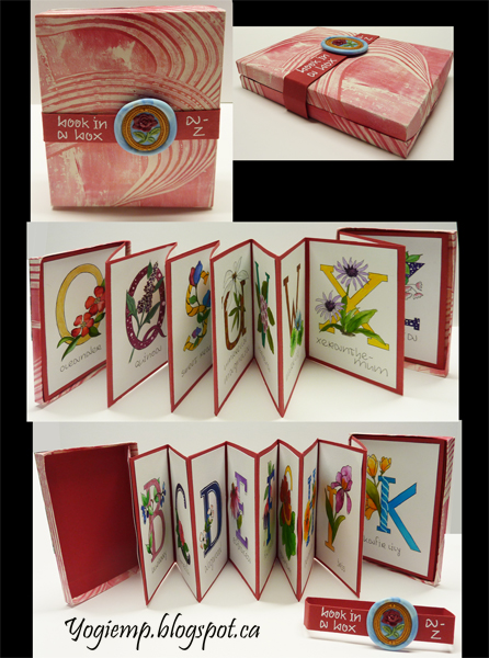 - Booklet Date Created: November 4, 2024 Booklet box created with heavy weight misc white cardstock and covered with my geli print paper. Red cardstock closure with title and one of my wax seals. On Canson Mixed Media paper drew out the letters and florals with a Juice Up pen that start with that letter. Coloring with various w/c media (Peerless w/c, ), accenting with gel pens.