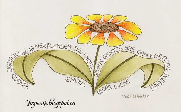 Created: June 23, 2024 I'm going thru my books by Helen William which I purchased eons ago. I loved her doodling and drawing skills... (and then 1 day she was gone... no idea what happened to her). I love this daisy... and of course had to put words to it... On Staples 110# cardstock outlined the flower with Juice Up pen and painted using Derwent Inktense watercolors. Quote done with the Juice Up pen in an Art Nouveau style. words: Thread lightly, she is near. Under the snow, speak gently, she can hear. The daisies grow. Oscar Wilde